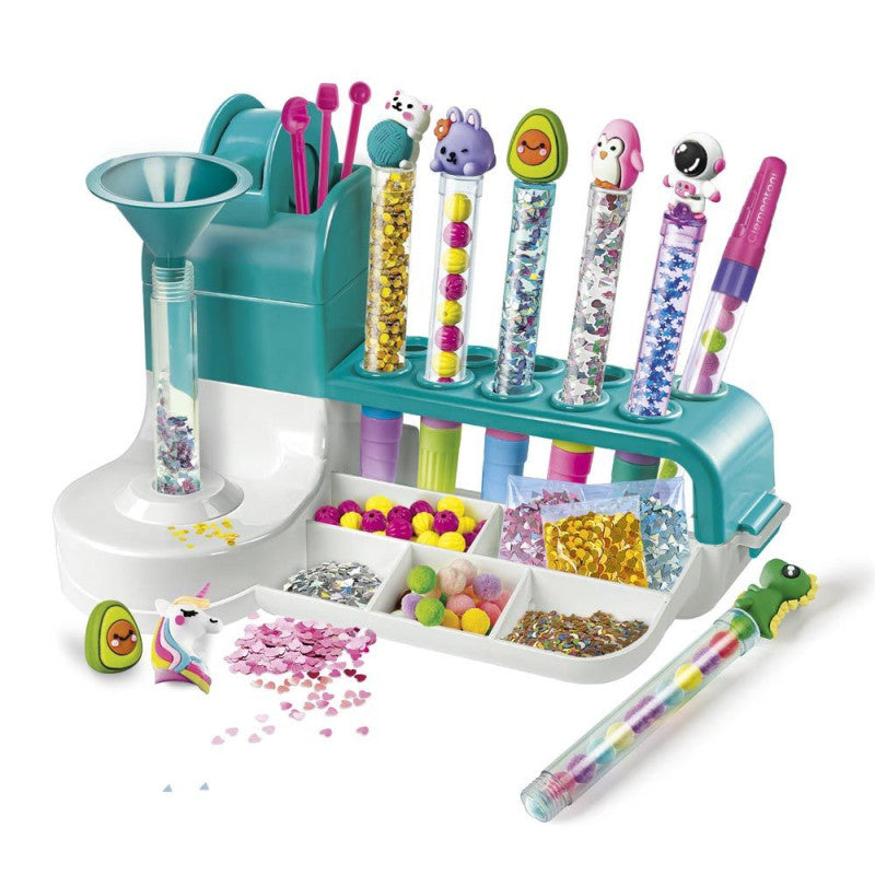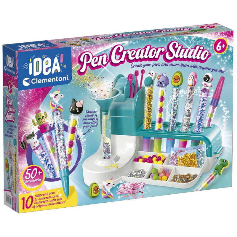 ¡Un estudio creativo original para divertirse haciendo muchos bolígrafos de colores y decorados! Este nuevo set permite a los niños crear y personalizar sus bolígrafos con muchos accesorios y decoraciones. ¡Una práctica estación de trabajo y un amplio conjunto de instrumentos que respaldan las actividades de juego ayudan a crear un resultado sorprendente! Los niños podrán hacer mucho más que personalizar un bolígrafo: ¡estarán completamente inmersos en la creación de sus propios diseños! Ideado y diseñado en Italia.